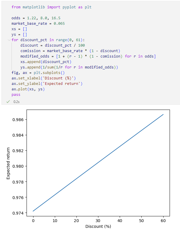 This means that we don’t pay a lot in order to play. But we haven’t taken commisions into account. As their comission, Betfair takes 6.5% of your winnings (if you live in Denmark). Taking this into account the odds of 1.22 turns out to only be effectively 1.2057, and if we do the updated calculation we receive roughly $0.974$. As you bet more, you can get a discount on these 6.5% (called the market base rate) of up to 60%. The plot below shows how this would impact the expected return of random betting (for this particular market).